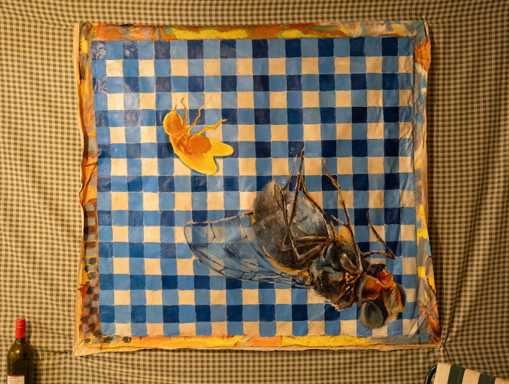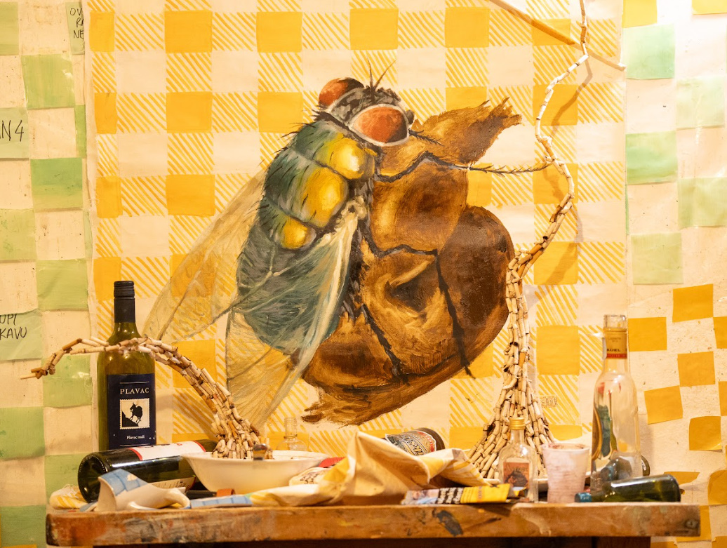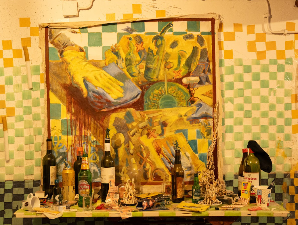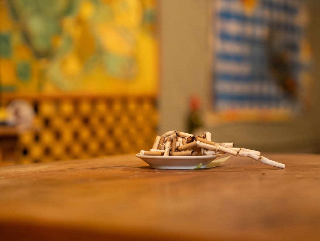 Stolovi na kojima vlada kaos, uzorak kvadratića koji ispunjava zidove s autoričinim slikama te ogromne cigarete pretvaraju prostor u subjektivno sjećanje.