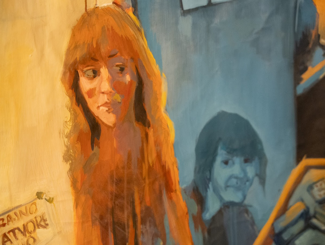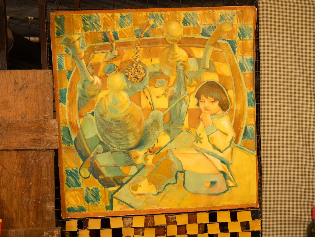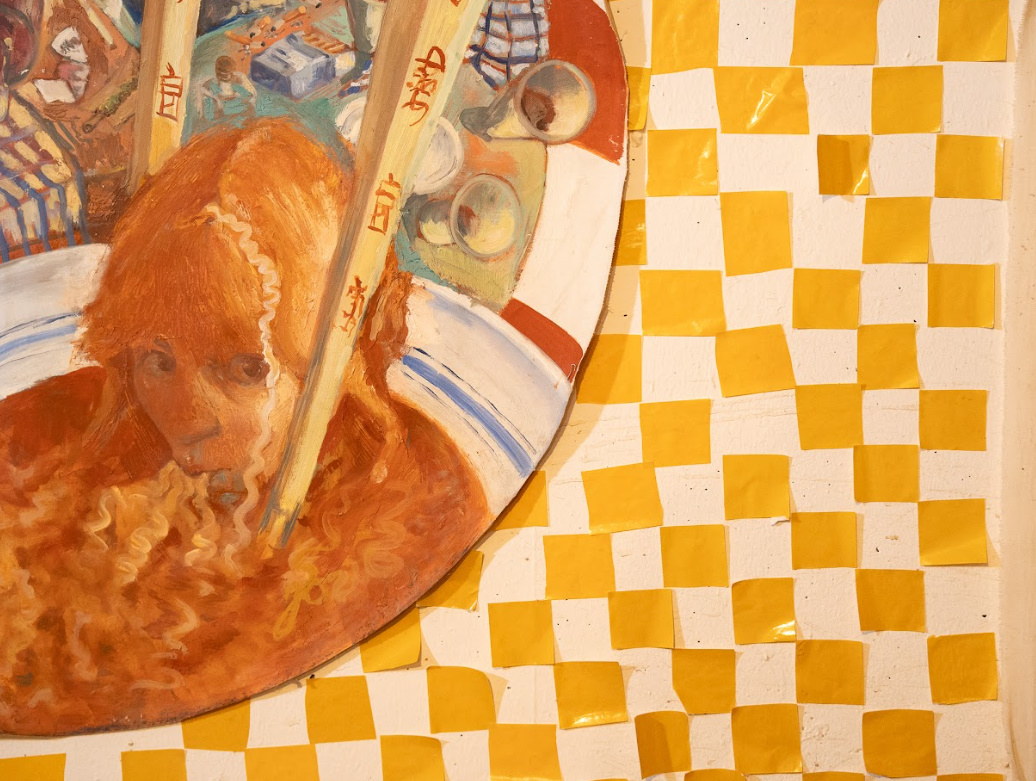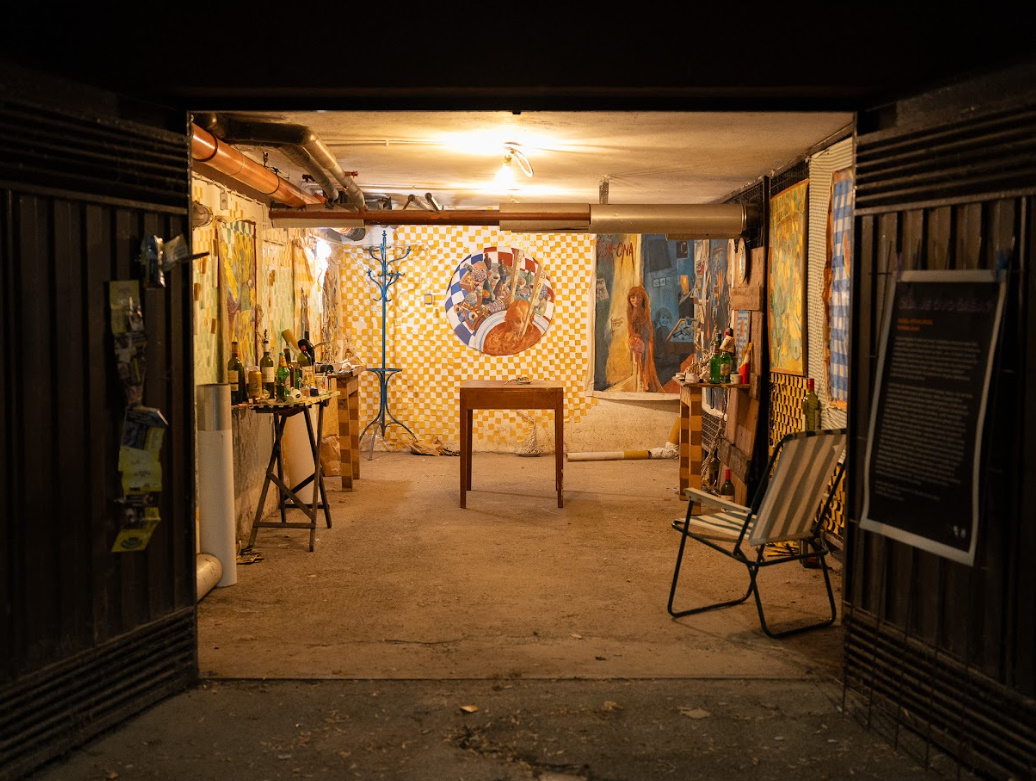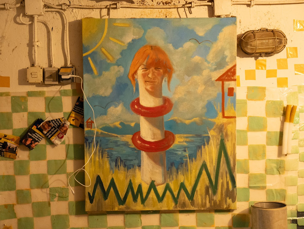 Stolovi na kojima vlada kaos, uzorak kvadratića koji ispunjava zidove s autoričinim slikama te ogromne cigarete pretvaraju prostor u subjektivno sjećanje.